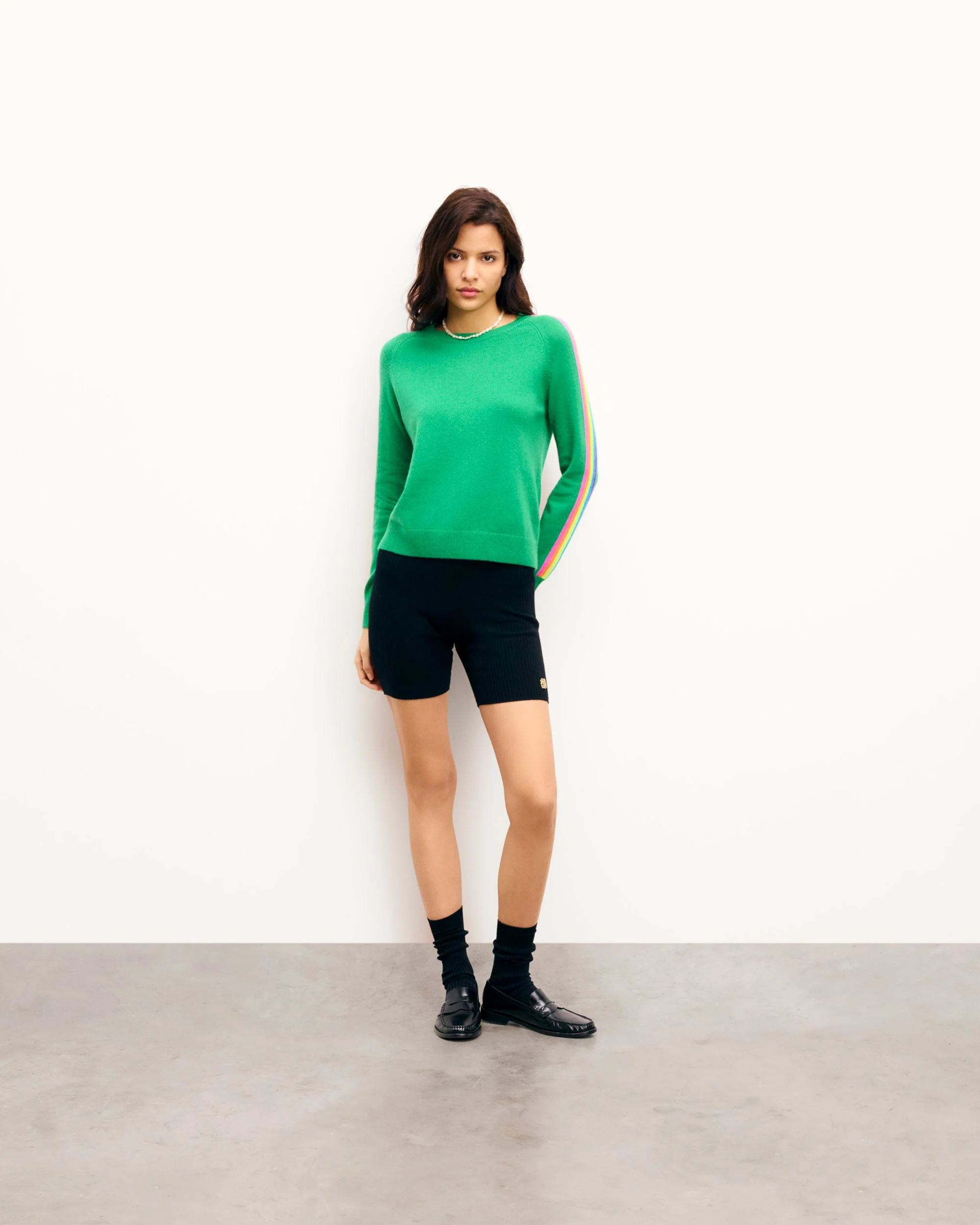 This cropped 2-ply cashmere sweater reveals multicolored stripes down the sleeves. It features a crew neck and ribbed edges, and pairs effortlessly with wide-leg jeans or a satin skirt.