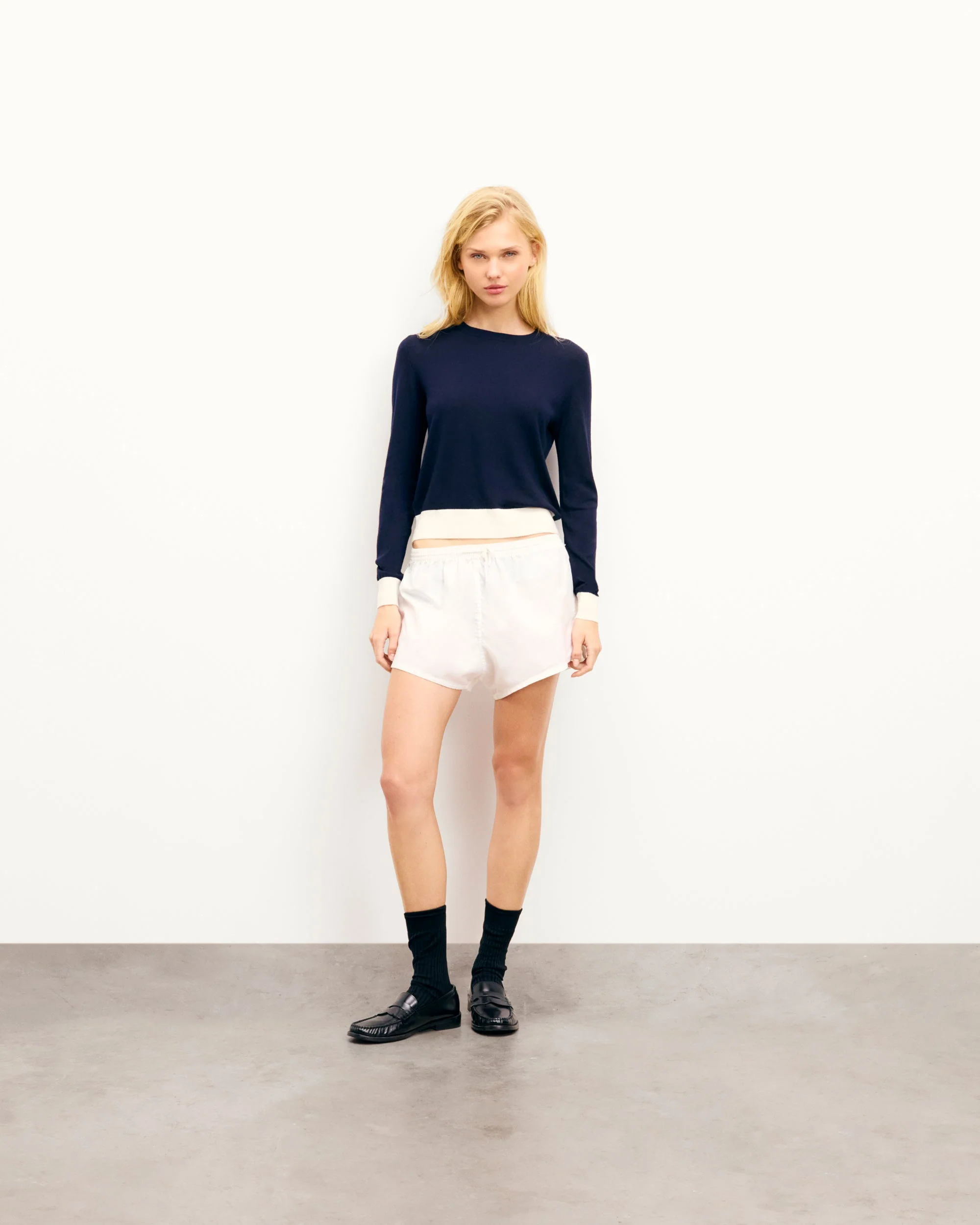 Crafted from 2-ply merino wool, this sweater creates a cropped silhouette with a contrasting ribbed hem. Its crew neck and long sleeves make it a versatile piece, perfect for pairing with relaxed jeans or a tailored skirt.