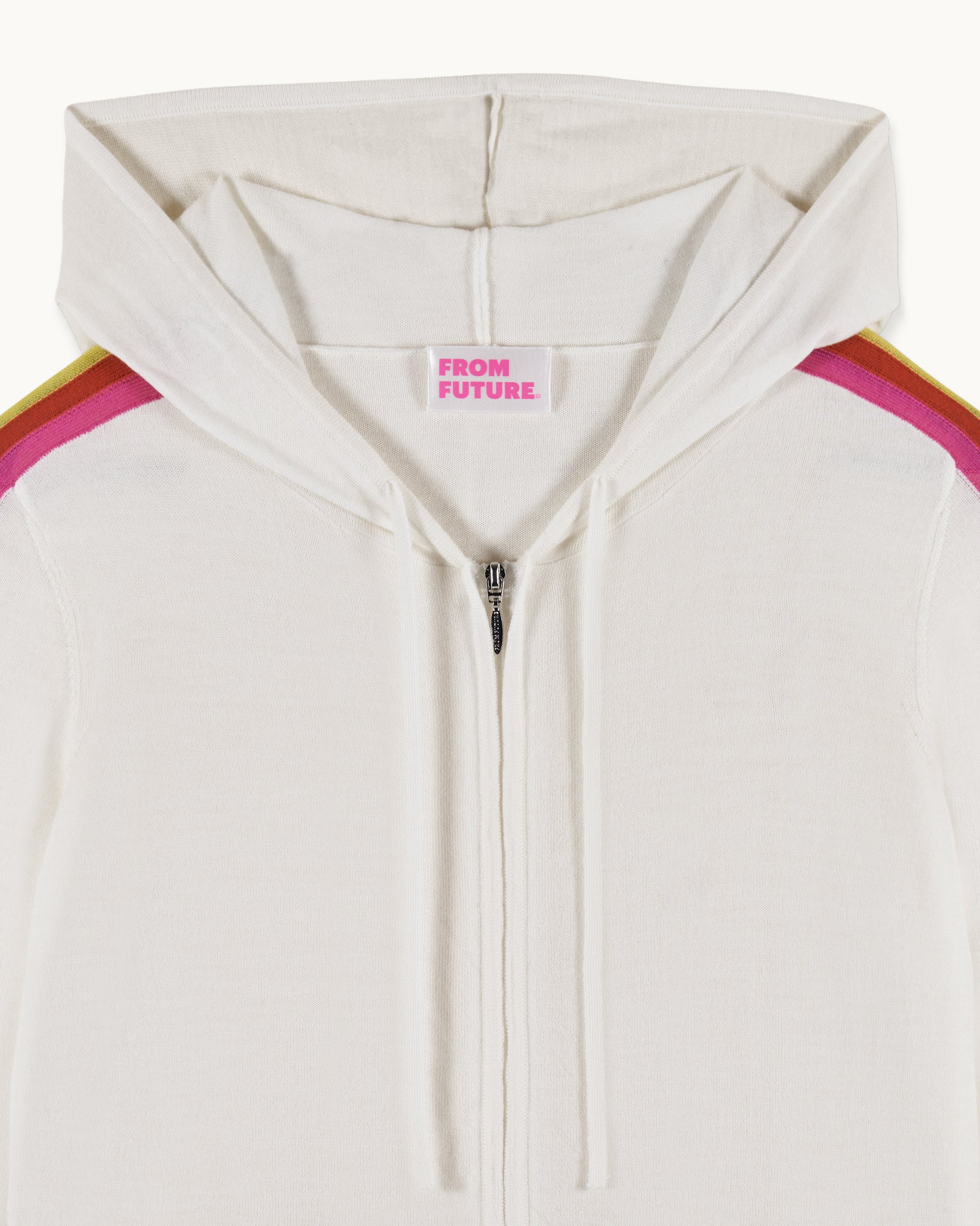 This cropped hoodie sweater reveals multicolored stripes along the sleeves, adding a signature From Future touch. Crafted from 2-ply merino wool, it features a drawstring hood, zip closure, and ribbed edges. Complete your look with casual jeans or straight-leg pants.
